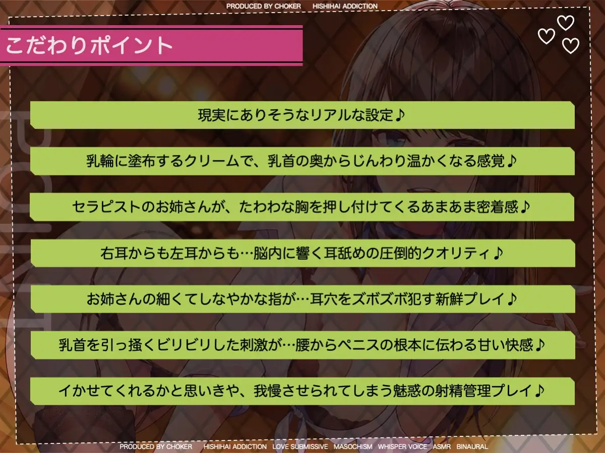 「最初はちょっとひやっとしますけど、段々と暖かくなっていきますからね。触りますね…は〜い、ぬりぬり、ぬりぬり…。指のお腹で、優しくすり込むように動かしていきますね。体温と摩擦で、だんだんと熱くなっていきますよ。ぬりぬり…ぬりぬり…どうですか?…じんわりと暖かくなってきましたか?ふふっ、気持ち良いですね。このままマッサージしますね。ぬりぬり、ぬりぬり…くりくり。くりくり。このクリームはお肌のターンオーバーを促して、メラニン……いわゆる黒い色の部分の、排出を手伝ってくれるんですよ。そうすると、段々お肌が本来の色に戻ってきますからね。ちゃんと乳首の部分だけじゃなくて、乳輪の部分にもクリームを塗っていきます…ふふっ、段々と乳首が硬くなってきちゃいましたね。良くあることですから、気にしなくて大丈夫ですよ♪」