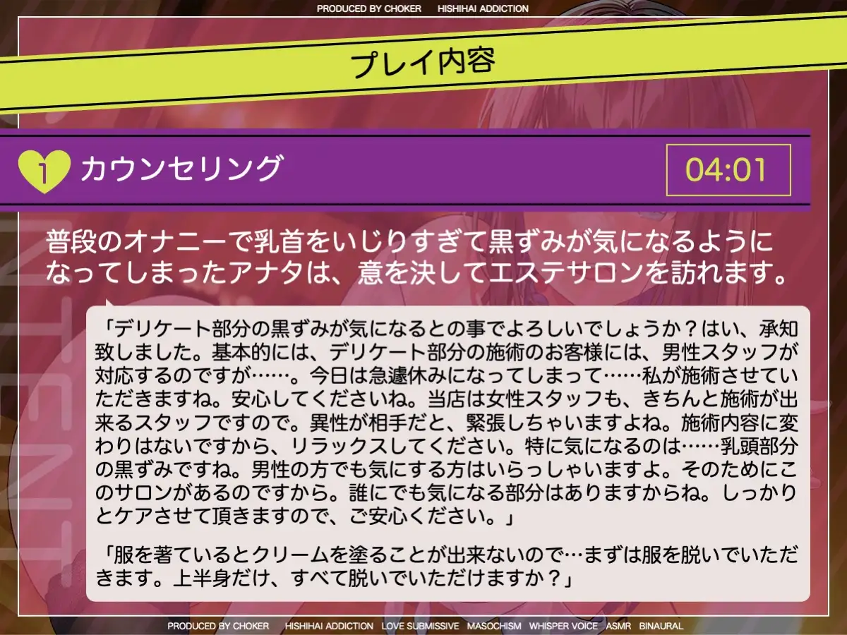 普段のオナニーで乳首をいじりすぎて黒ずみが気になるようになってしまったアナタは、意を決してエステサロンを訪れます。
