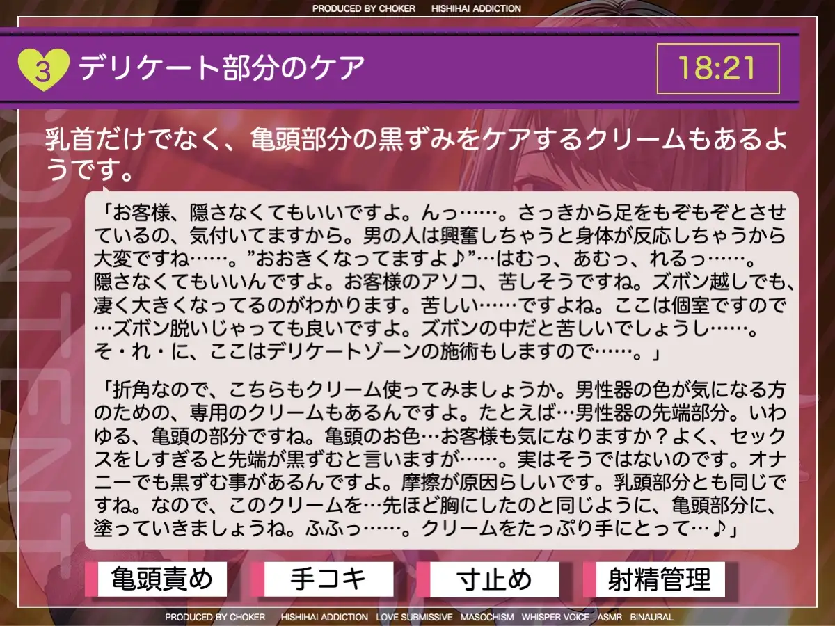 「折角なので、こちらもクリーム使ってみましょうか。男性器の色が気になる方のための、専用のクリームもあるんですよ。たとえば…男性器の先端部分。いわゆる、亀頭の部分ですね。亀頭のお色…お客様も気になりますか?よく、セックスをしすぎると先端が黒ずむと言いますが……。実はそうではないのです。オナニーでも黒ずむ事があるんですよ。摩擦が原因らしいです。乳頭部分とも同じですね。なので、このクリームを…先ほど胸にしたのと同じように、亀頭部分に、塗っていきましょうね。ふふっ……。クリームをたっぷり手にとって…♪」