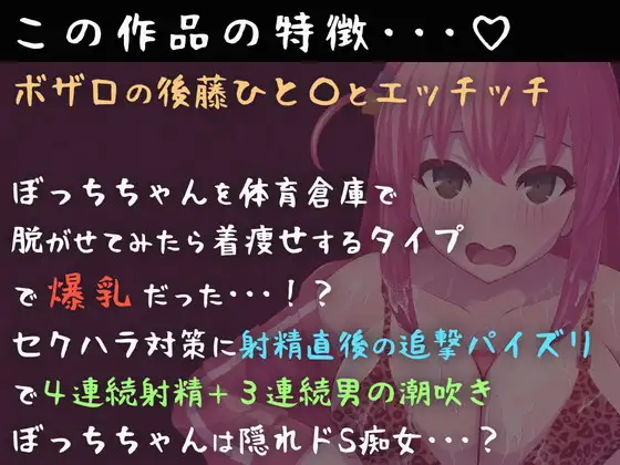 彼女のジャージの下には、はち切れんばかりの爆乳おっぱいが、挑発的なブラジャーに包まれている。後藤ひと〇ちゃんには似つかわしくない蠱惑的な暴力的な模様にドギマギ。山田リョ〇ちゃんが見たら、無表情な彼女でも驚くだろう。喜多郁〇ちゃんは「ぼっちちゃんおっぱいデカいのねー!」と褒めるだろうか。伊地知虹〇や廣井きく〇はジャージの下に知らない後藤ひと〇がいるとハシャぐかもしれない。そう、彼女は着痩せ巨乳・・・いや爆乳だったのだ! それを知らずに体育倉庫に後藤ひと〇を呼び出した貴方。貴方は、オドオドとした愛らしい彼女に「ジャージ脱いで」と命令系懇願をする。しかし、脱いだには脱いだが予想だにしないマスクメロン爆乳おっぱいが現れた。そして、陰キャでぼっちの彼女にもプライドがある。ぼっちちゃんこと後藤ひと〇は、仲間から教わったお仕置き方法を試すことにした。夜の体育倉庫に監禁拘束された貴方は・・・。