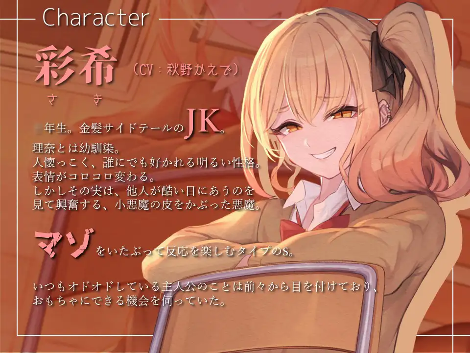 ジャンル | バイノーラル/ダミヘ,ギャル,学校/学園,オナサポ,SM,言葉責め,羞恥/恥辱,本番なし |