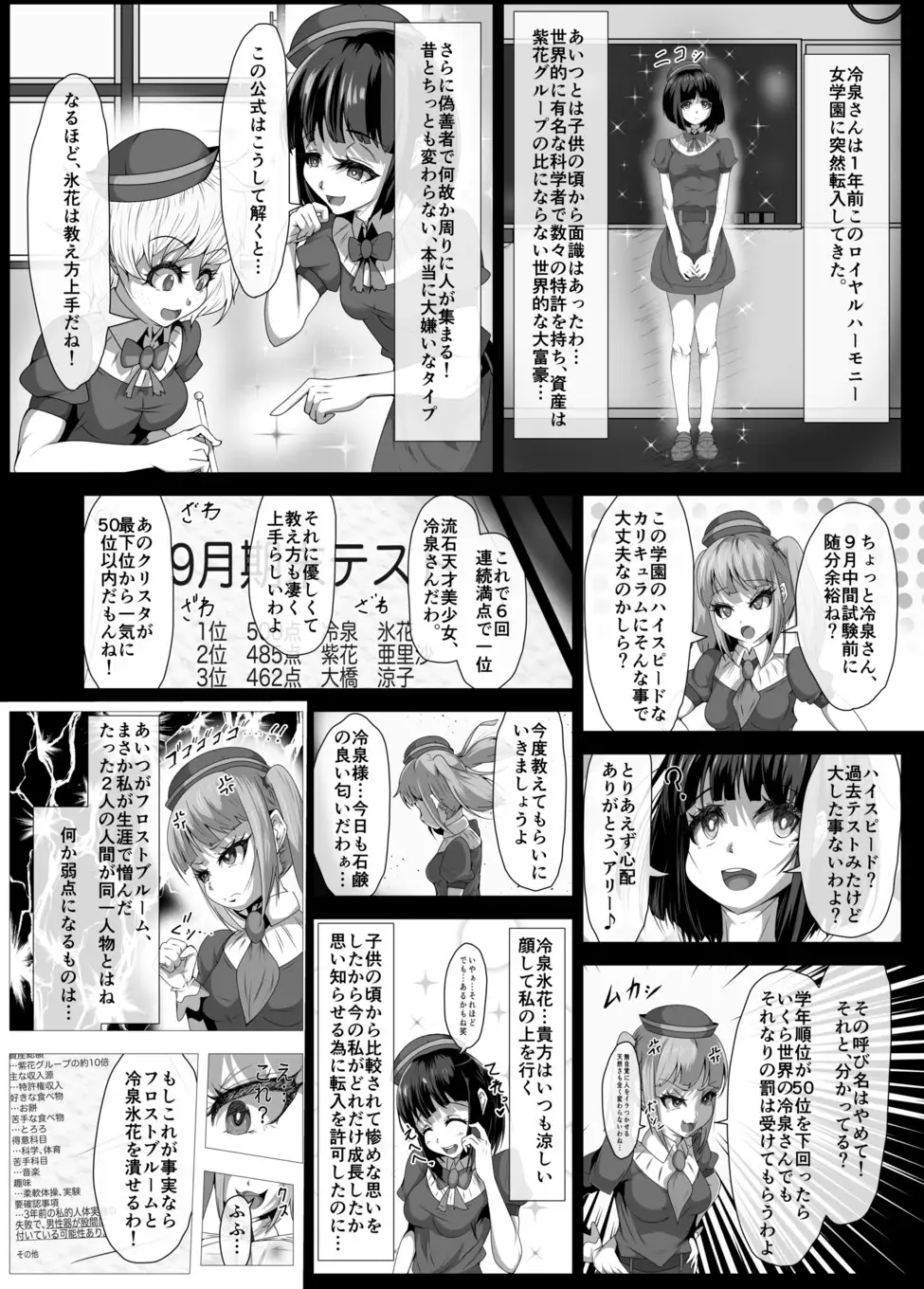 学園は想像以上に腐敗しており、月に2回行われるテストで学年順位が50位を下回る生徒に性的な体罰を重ねたり、激しい体罰で洗脳した生徒を紫花グループの危険なビジネスに斡旋したりと散々なあり様である。